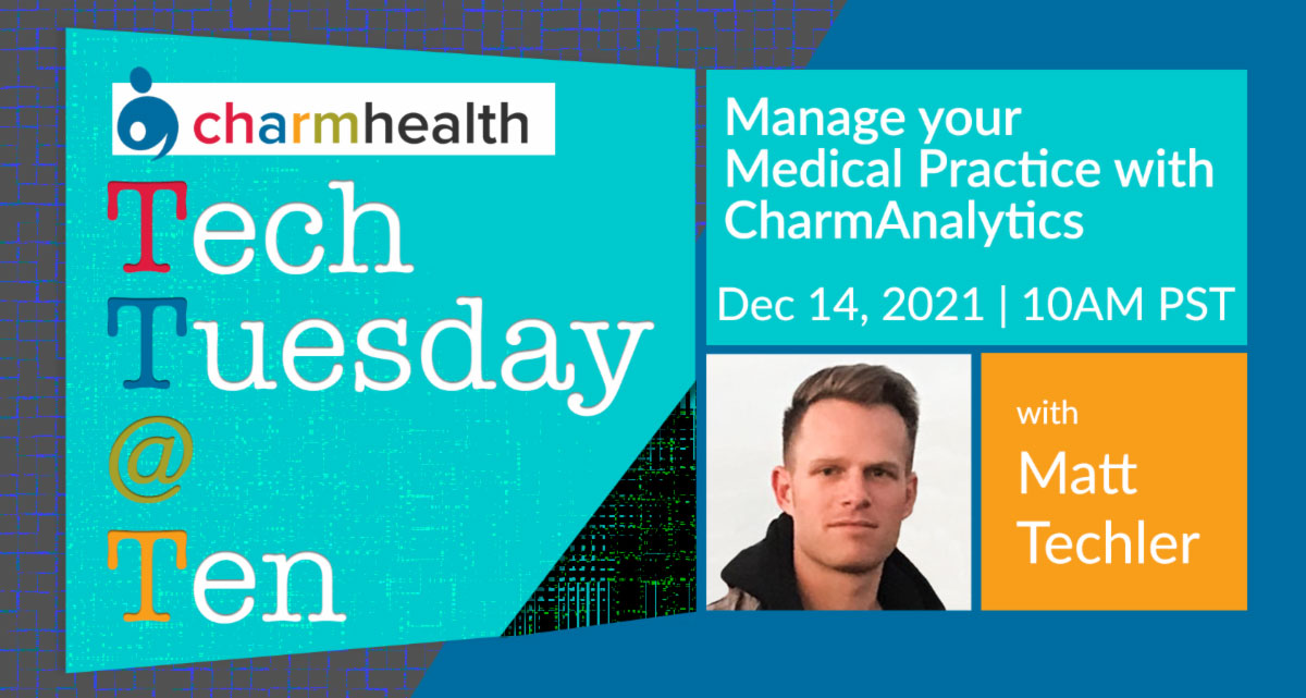 Learn about CharmAnalytics on a new episode of Tech Tuesday @ Ten on December 14th. Session will be followed by a Q&A with CharmHealth experts. Did you miss out on the very first Tech Tuesday @ Ten? Watch the episode on eRx & EPCS here. |